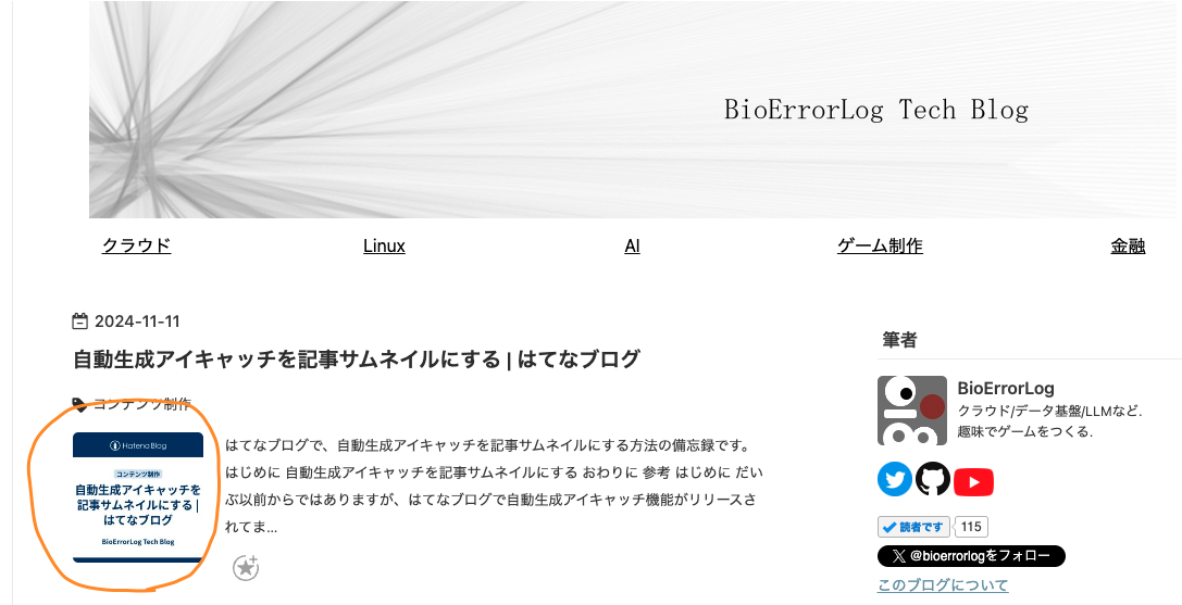 はてなブログ公式の記事によると、2023年の11月から自動生成アイキャッチを記事サムネイルに設定する機能が使えたようですね。