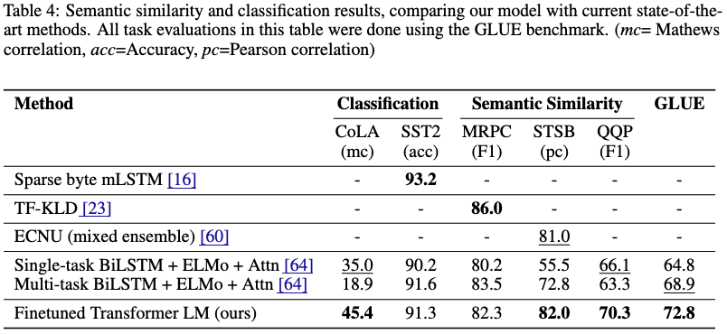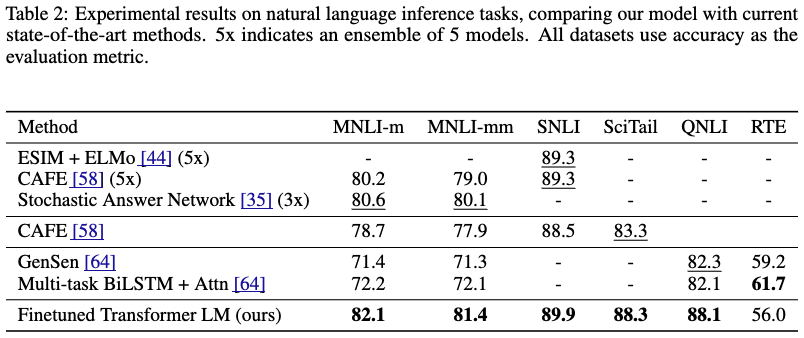 - ラベルなしテキストデータによる汎用事前学習を行なったのち、タスク特有のラベルあり学習データでfine-tuningを行う二段構成