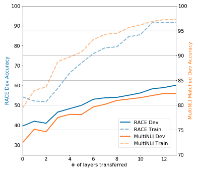 - 転移学習に使った事前学習layerが多ければ多いほど、タスク精度は高かった